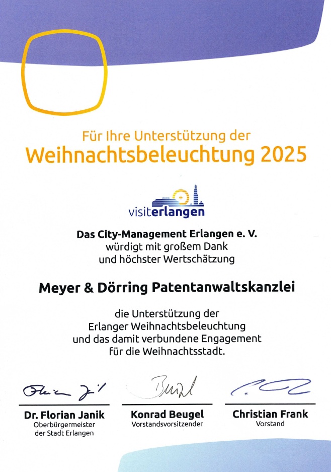 Die Patentanwaltskanzlei Meyer & Dörring unterstützt auch im Jahr 2025 wieder die Weihnachtsbeleuchtung in Erlangen.